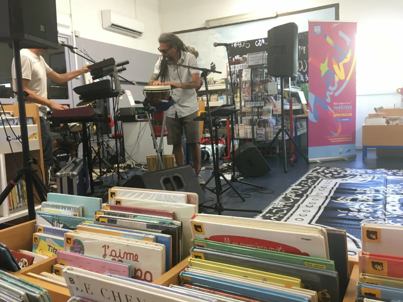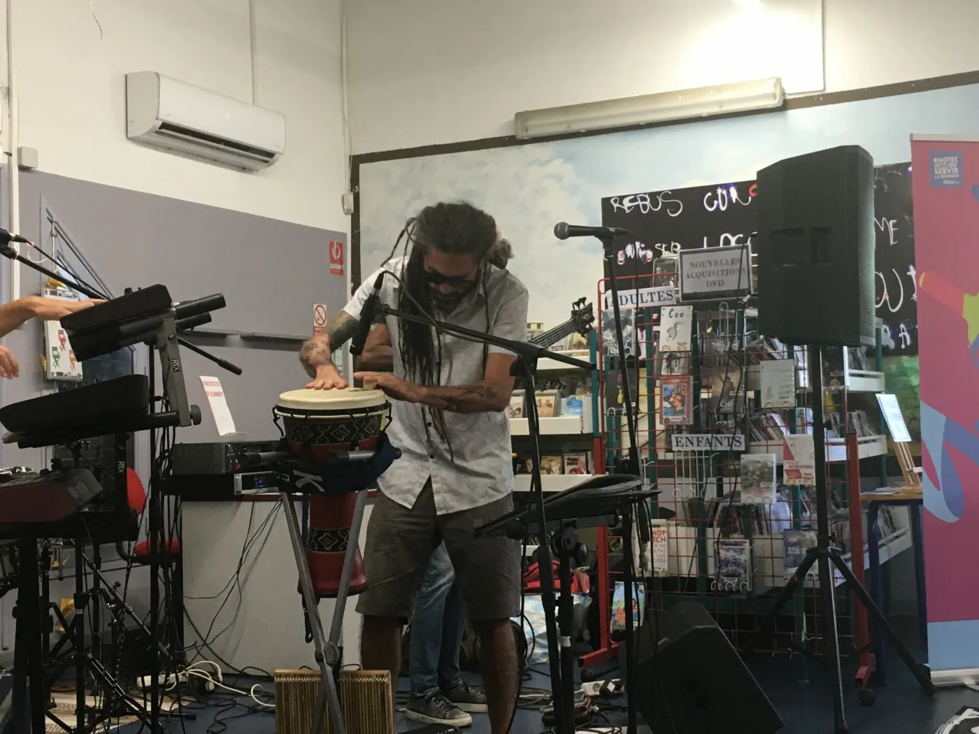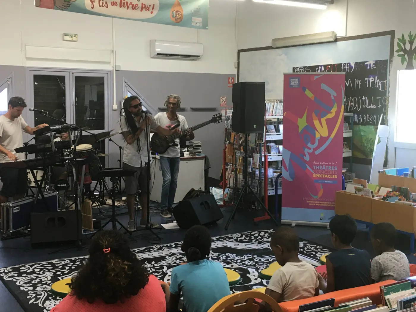 Un concert en toute intimité ! Entre les rayons de livres, basse, batterie, guitare, claviers, 4 musiciens et une ambiance reggae. Ce mercredi 13 novembre, pendant une heure Sly Sugar a partagé son univers musical avec les lecteurs et habitants du Port. Sly Sugar, un groupe de Saint Benoit, crée en 2016 est présenté comme l’un des groupes dub les plus inventifs de La Réunion. Le dub reste le fil conducteur mais la formation emprunte facilement les chemins de nombreux styles musicaux, jouant avec l’électronique et en misant surtout sur la musique en live.