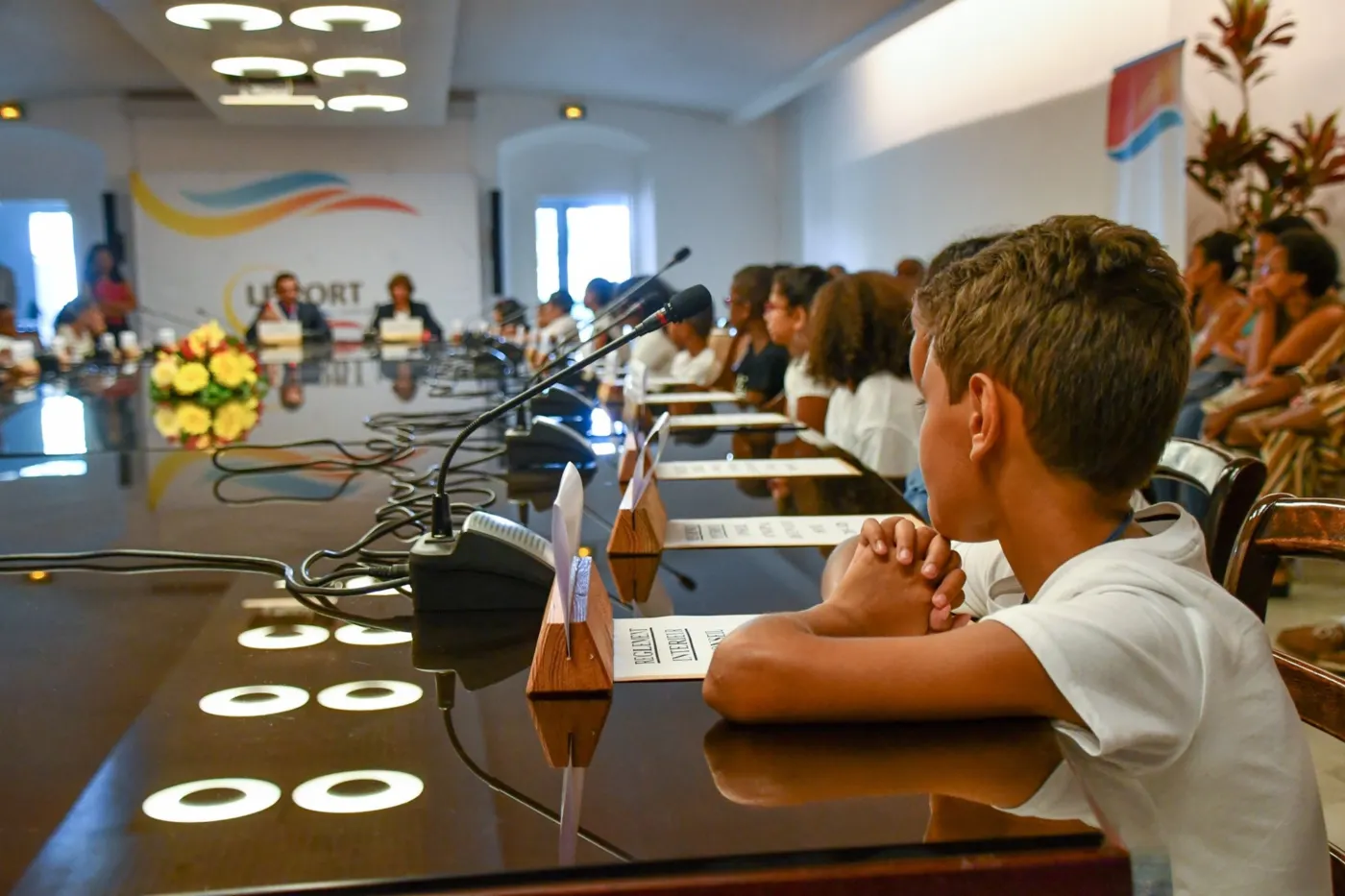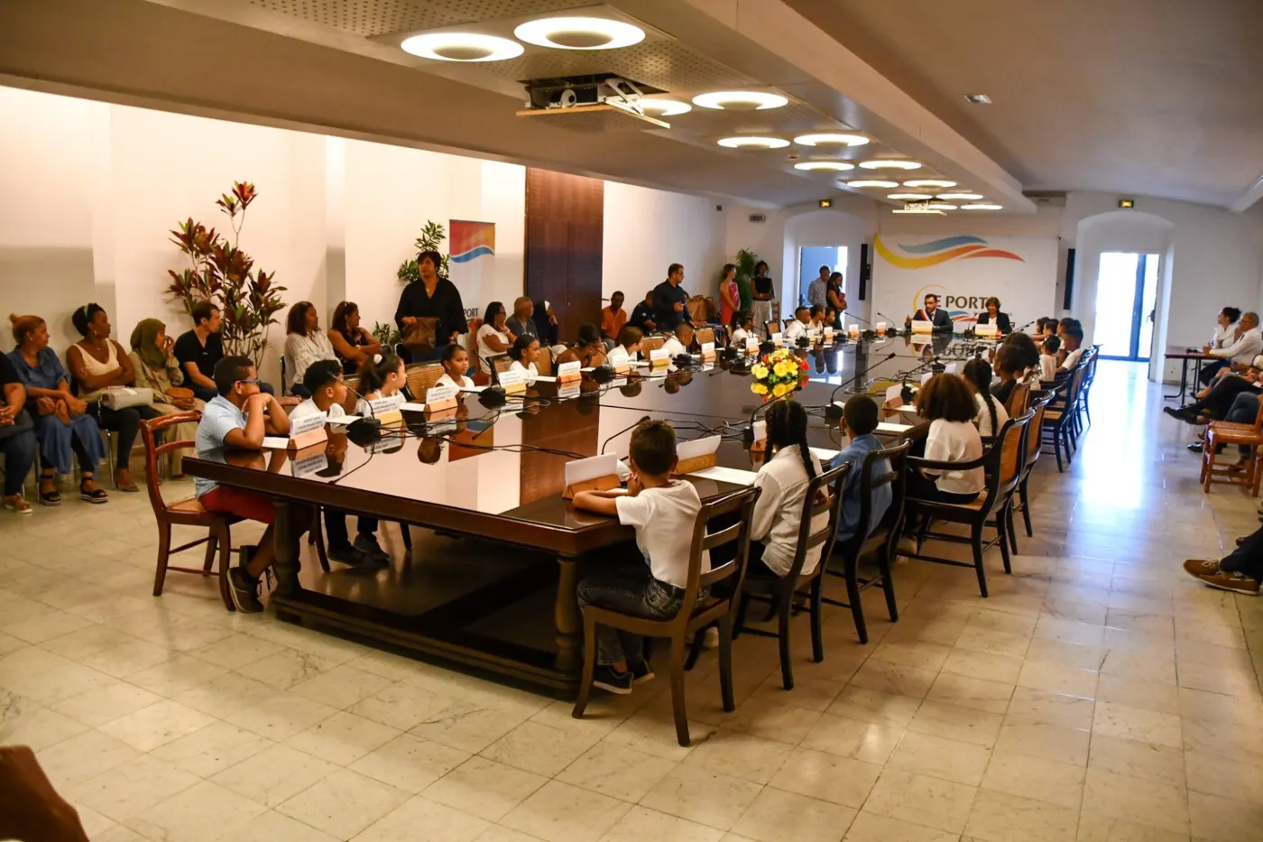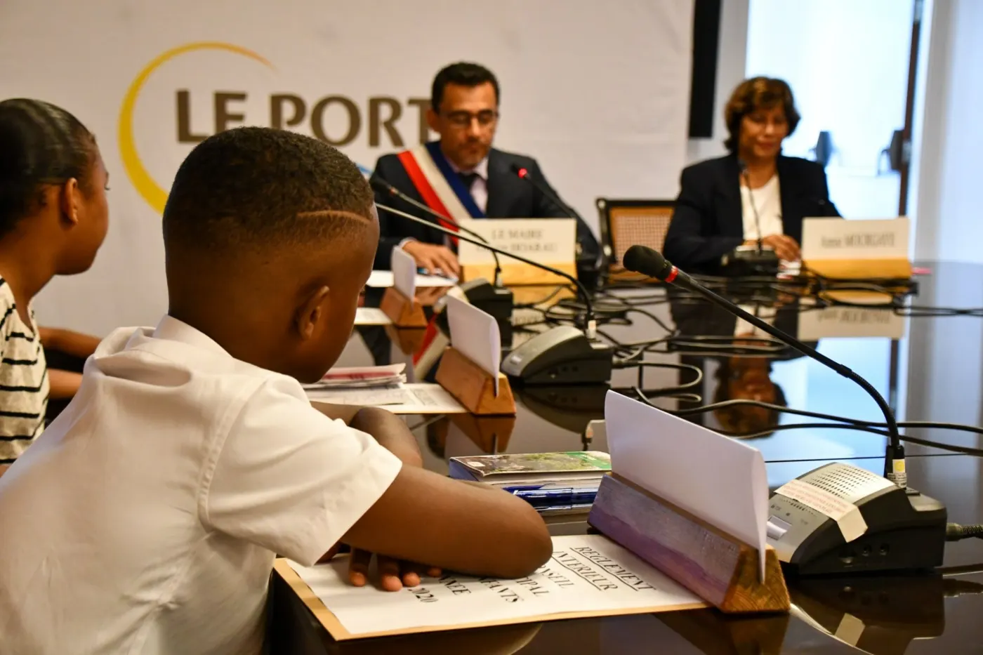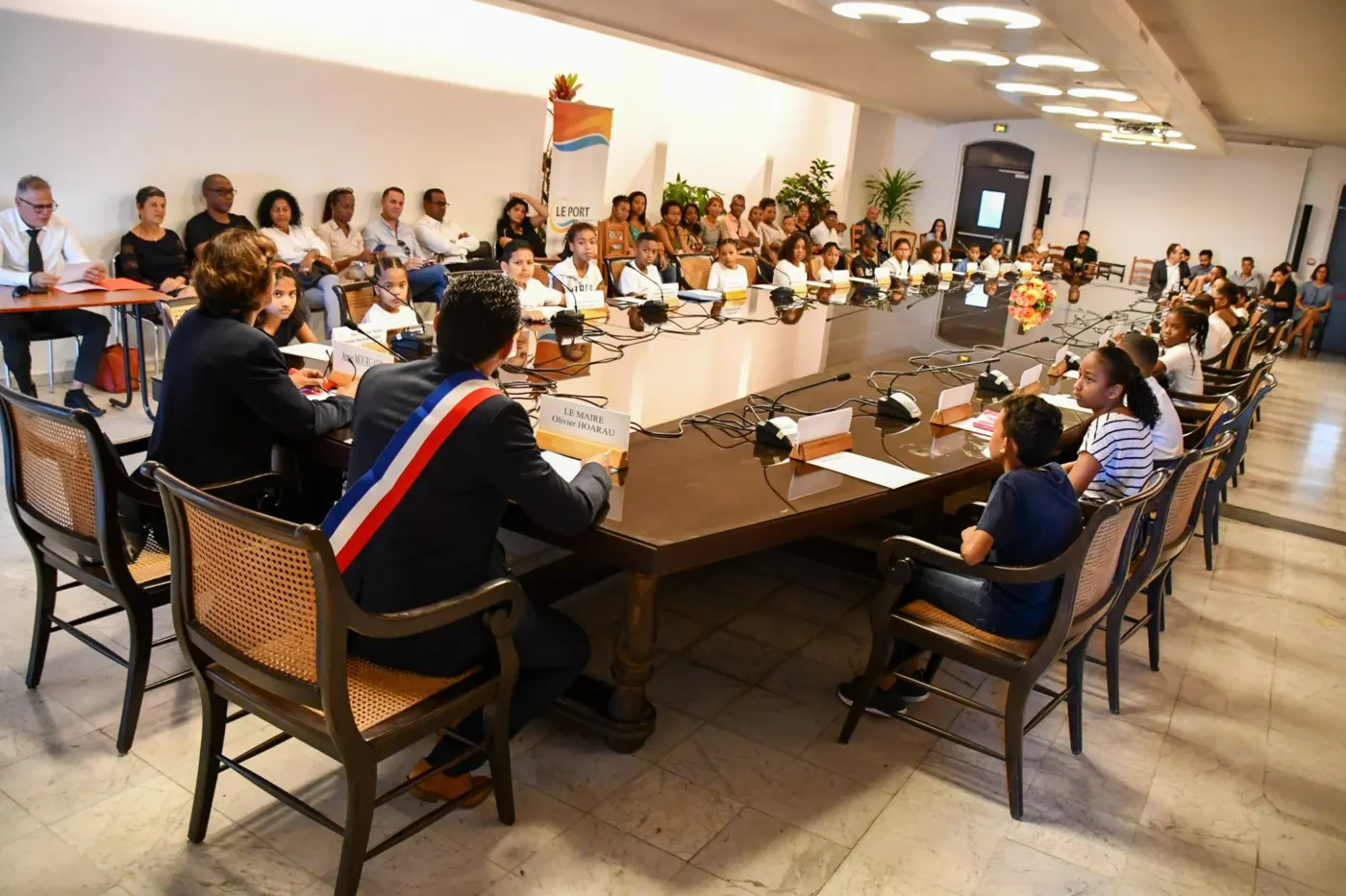 28 élèves de CM1 et de CM2 des écoles de la ville ont reçu ce jeudi 03 octobre leurs écharpes tricolores des mains du maire Olivier Hoarau et d’Annie Mourgaye, l’élue en charge de l’Éducation. Installation des conseillers municipaux Enfants pour la 2ème année. Porte-paroles des écoliers du Port, ces élus-enfants participeront à l’élection du maire-Enfant le 31 octobre prochain.
