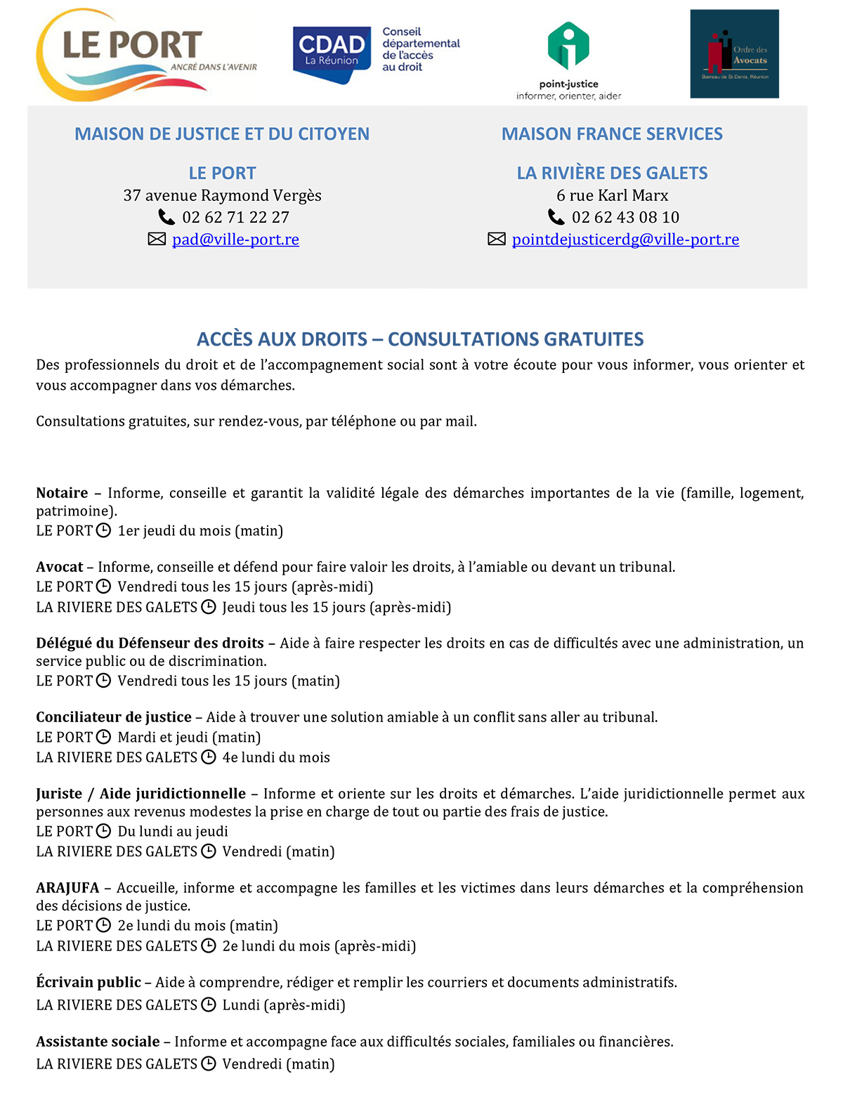 Ces consultations sur rendez-vous, par mail ou téléphone sont organisées dans le cadre d’une convention entre la ville du Port, le Conseil Départemental d’Accès au Droit et la Maison des Avocats.
