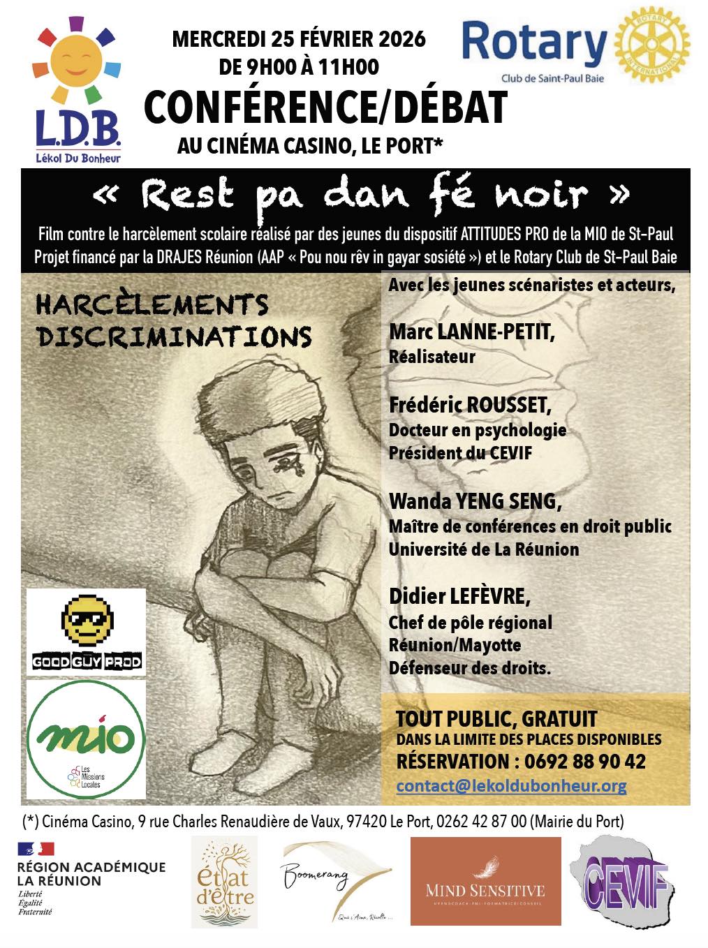 [Conférence/débat] A découvrir, ce mercredi 25 février au cinéma Casino du Port le film « Rest pa dan fé noir » sur le thème du harcèlement scolaire.