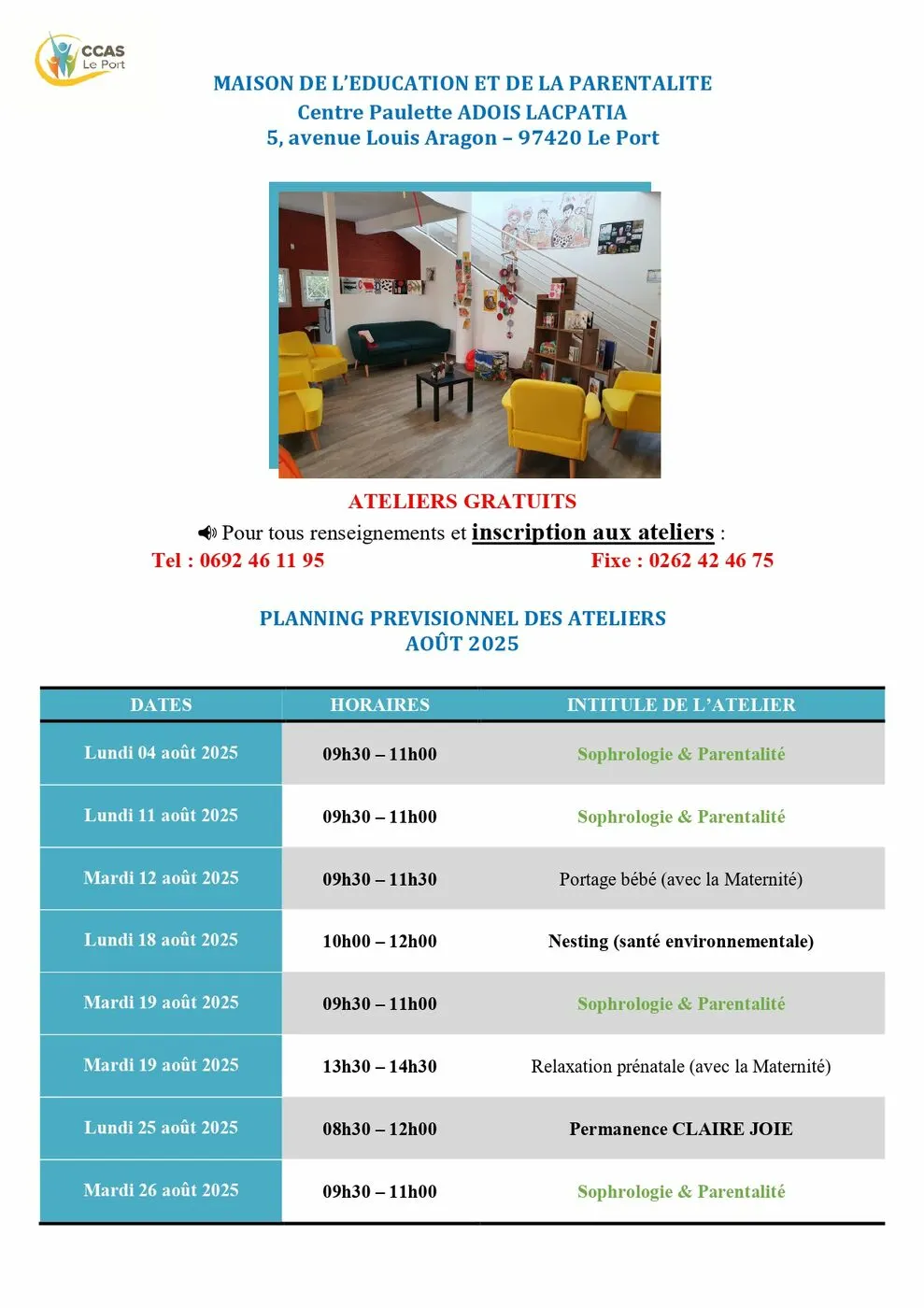 La Maison de l’Éducation et de la Parentalité vous propose des ateliers autour du bien-être. Sophrologie, massage bébé, portage, gestion des émotions Ateliers santé : nutrition, environnement Accompagnement spécifique pour les familles avec enfants TND 5 avenue Louis Aragon, Le Port Infos & inscriptions : 0692 46 11 95 / […]