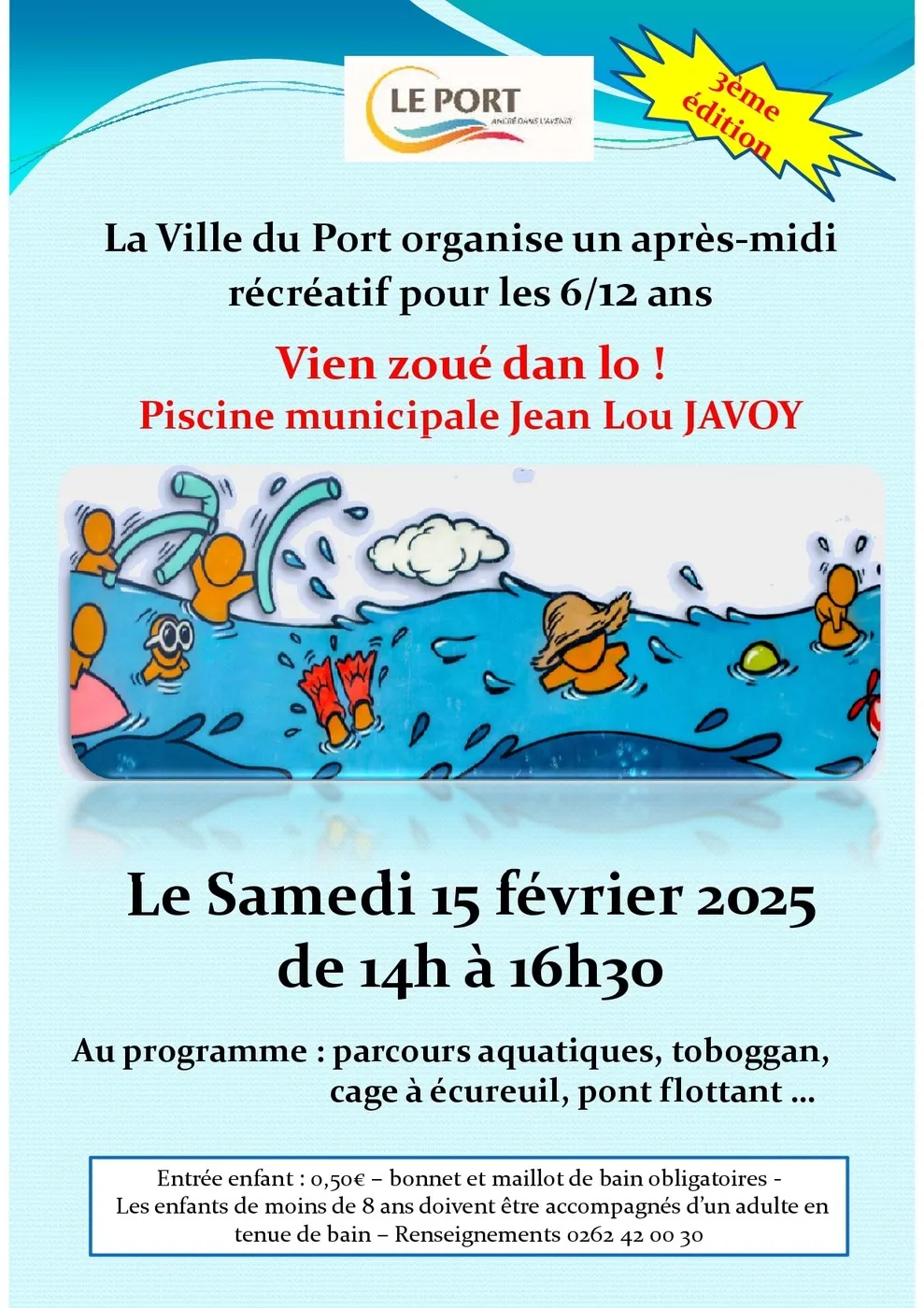 Animation proposée par la ville du Port pour les enfants âgés entre 6 et 12 ans. Samedi 15 février 2025 de 14h à 16h30 à la piscine municipale Jean-Lou Javoy. Au programme : parcours aquatiques, toboggan, cage à écureuil, pont flottant entre autres. Entrée enfant 0,50€, enfants de moins de […]